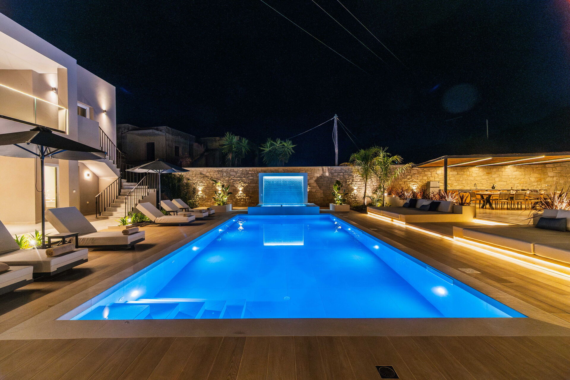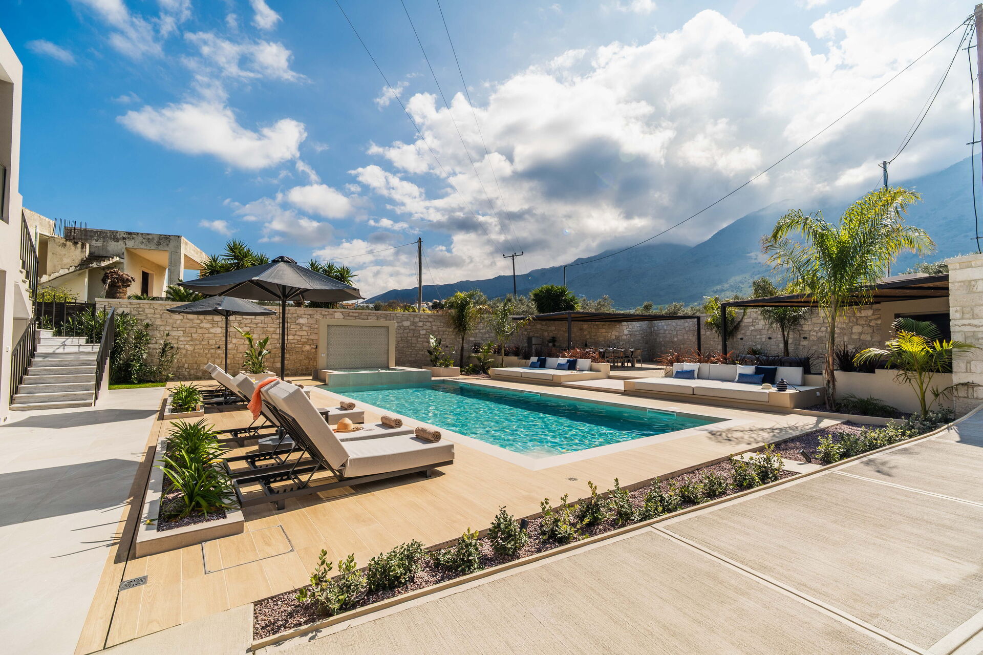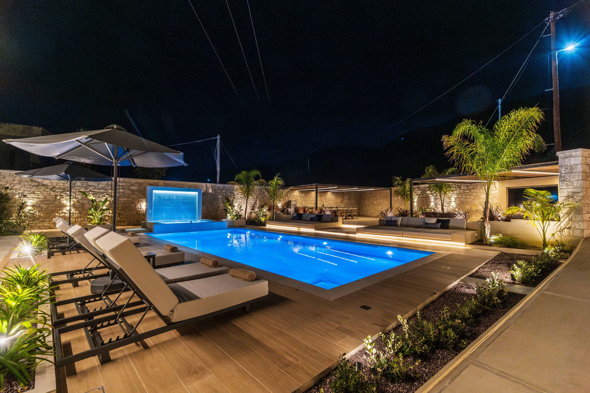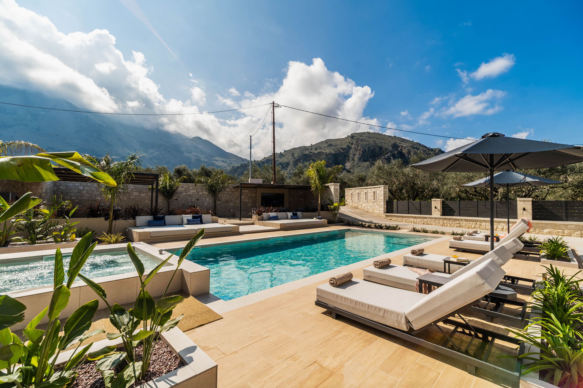 All'esterno ci sono una bella zona attrezzata per poter mangiare all'aperto, una vasca idromassaggio con cascata e una bellissima piscina privata in cui rilassarsi e divertirsi insieme ad amici e familiari nelle calde giornate cretesi.