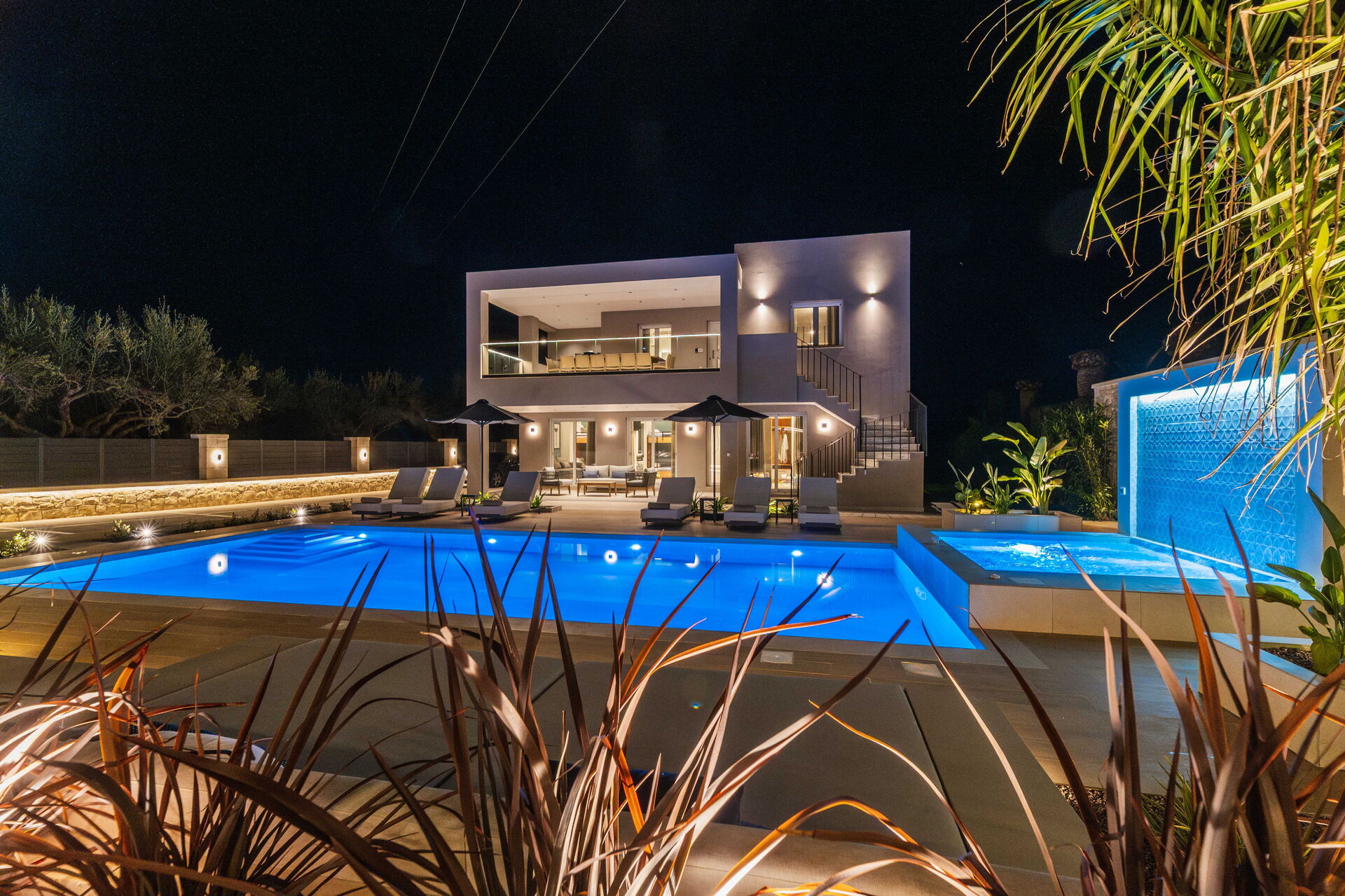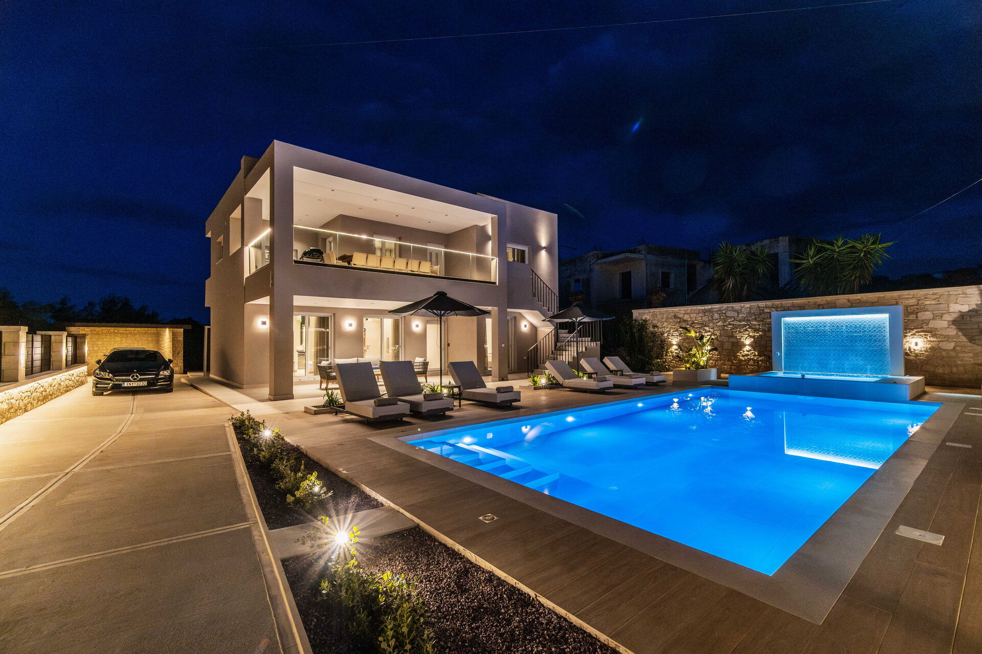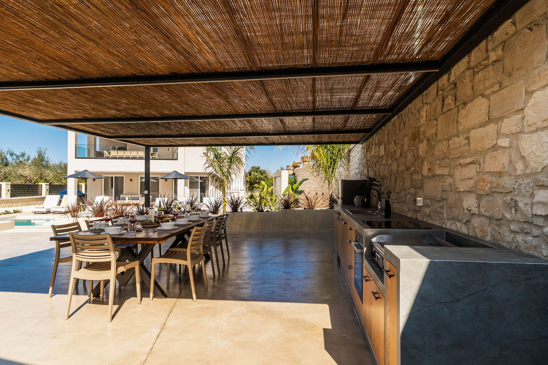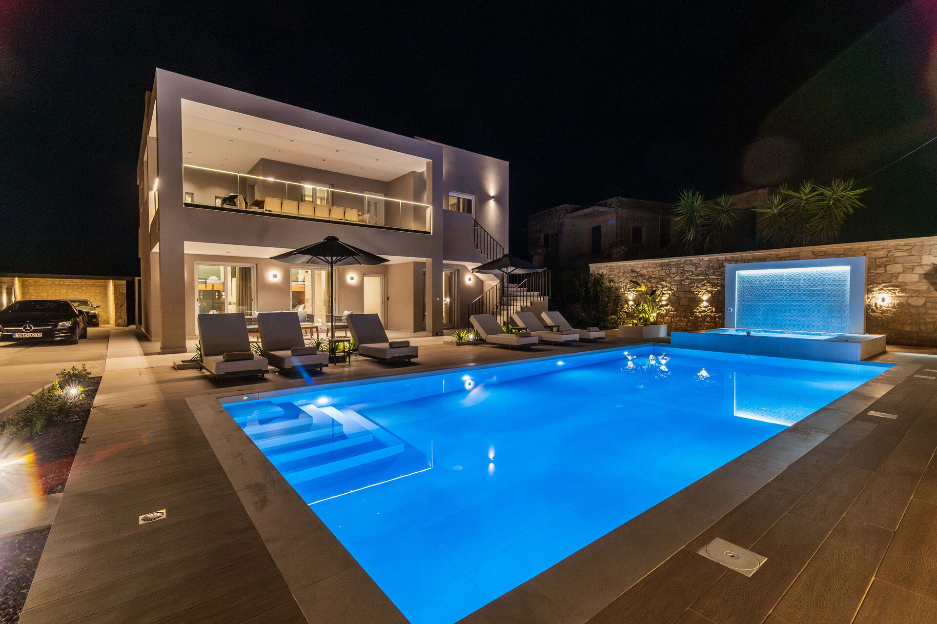 All'esterno ci sono una bella zona attrezzata per poter mangiare all'aperto, una vasca idromassaggio con cascata e una bellissima piscina privata in cui rilassarsi e divertirsi insieme ad amici e familiari nelle calde giornate cretesi.