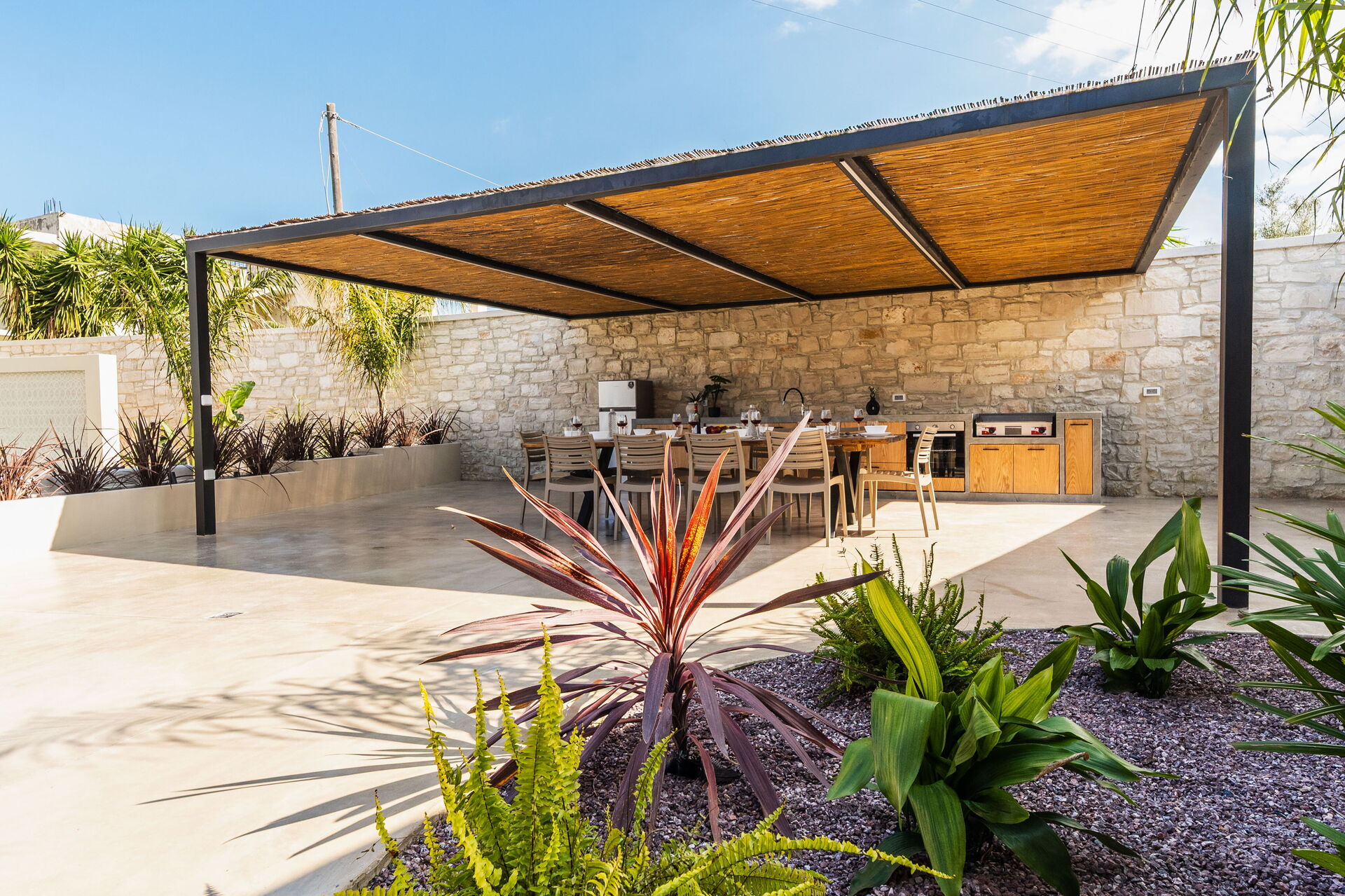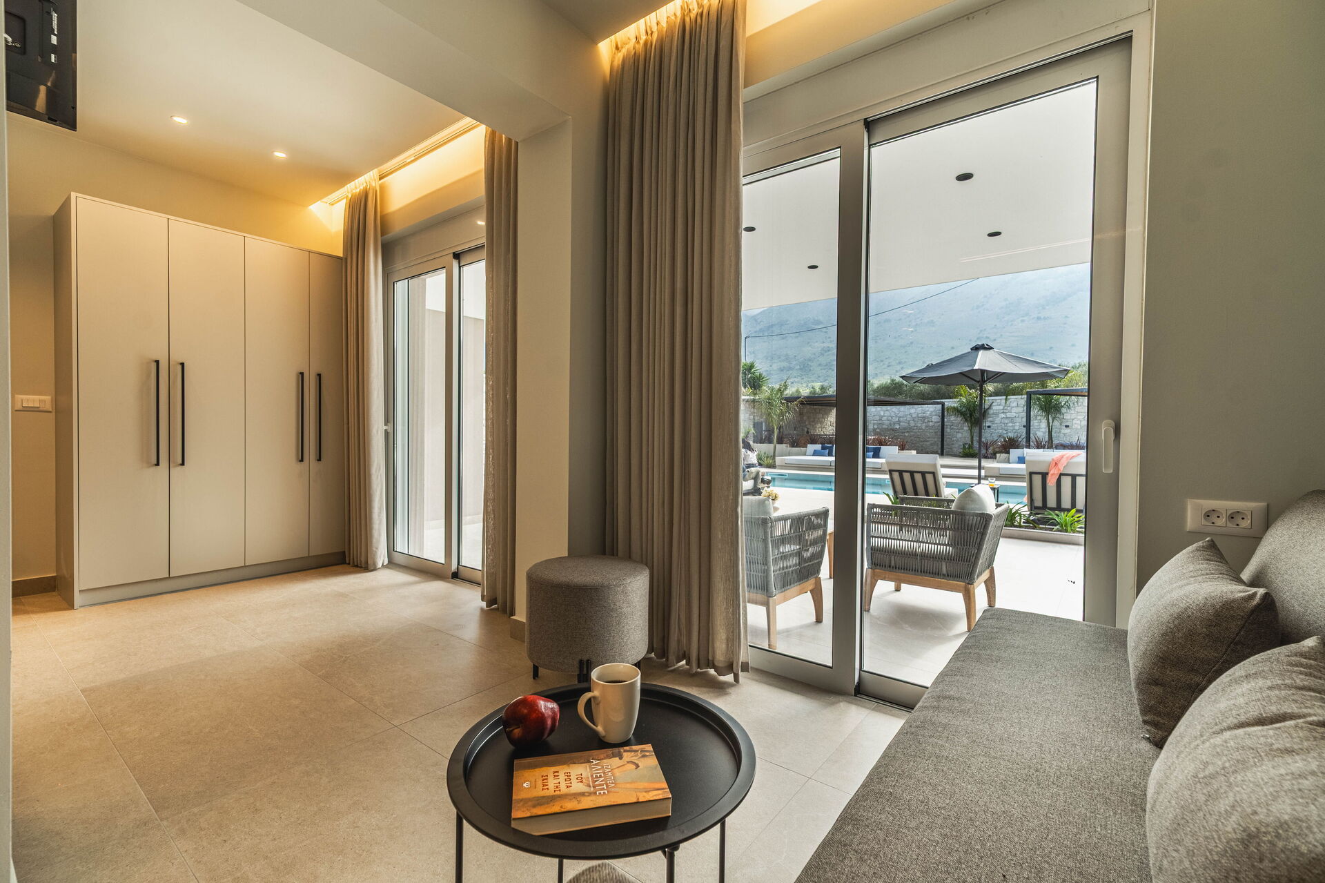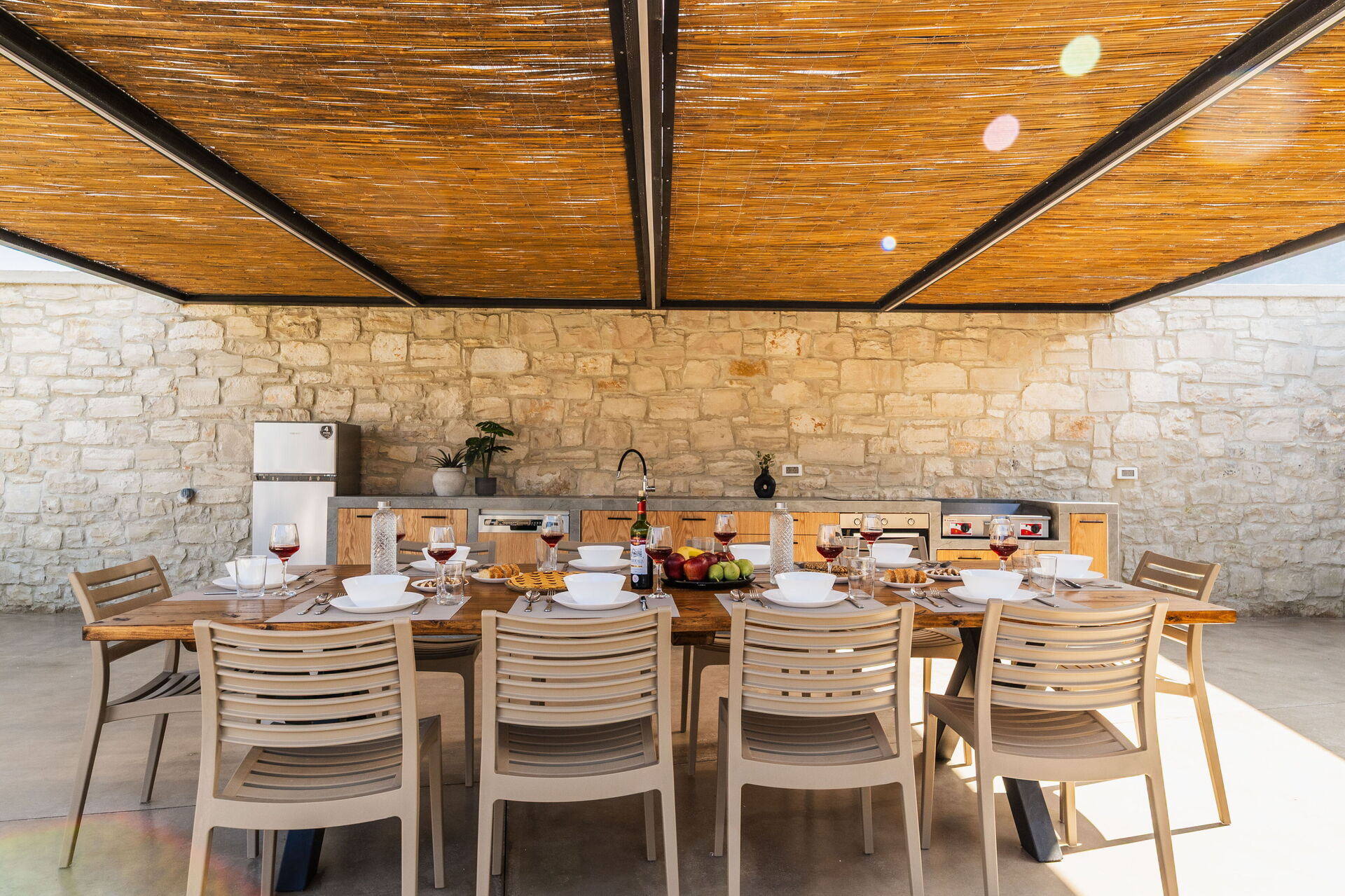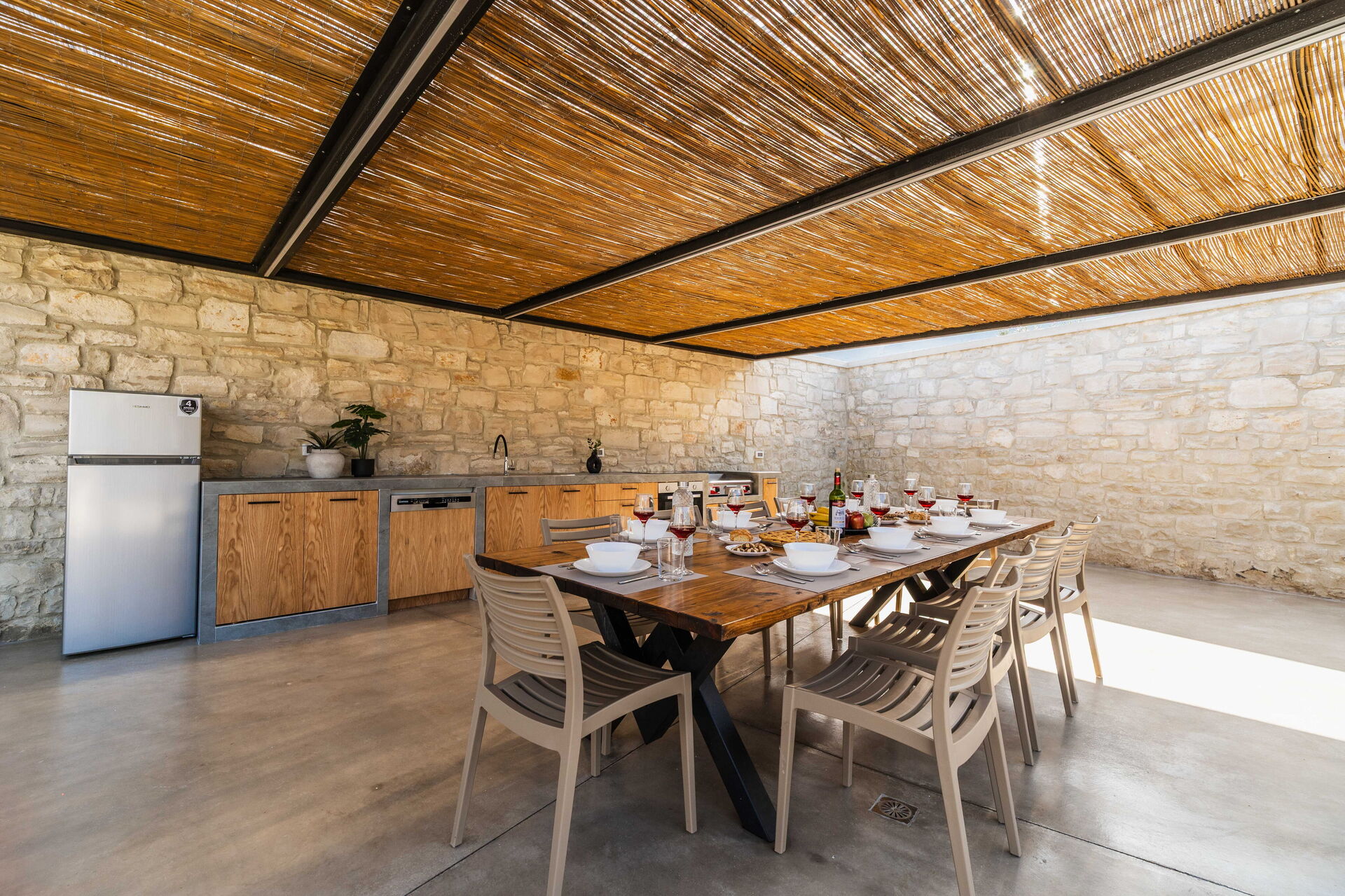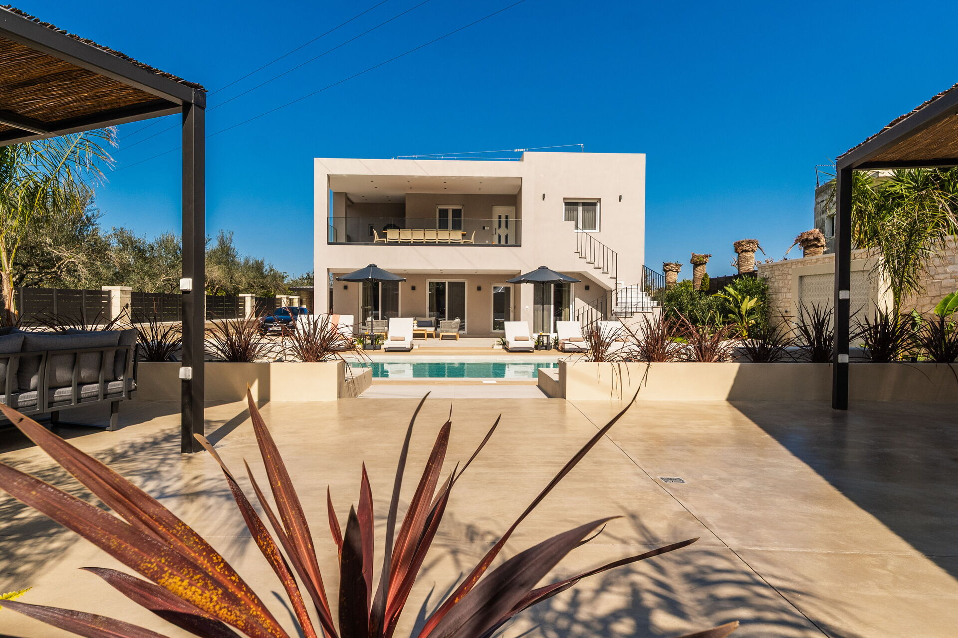All'esterno ci sono una bella zona attrezzata per poter mangiare all'aperto, una vasca idromassaggio con cascata e una bellissima piscina privata in cui rilassarsi e divertirsi insieme ad amici e familiari nelle calde giornate cretesi.